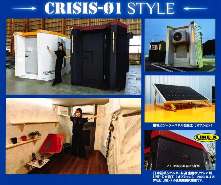 本体は約W4000mm×D2000mm×H2300mm、重さは約2.4トンで、断熱材と鉛板で内壁を保護。室内には冷暖房エアコン、防犯カメラ、非常脱出口、外部電源口などを完備し、停電時にはポータブル電源での運用も可能です。さらに、ソーラーパネルや非常食、ポータブルトイレといったオプションも充実。