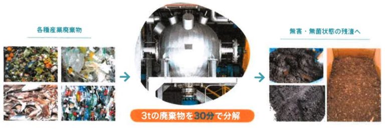 【PHANTOM】は、環境負荷の少ない革新的な有機性廃棄物処理装置です。生ゴミ、木材、農業・水産廃棄物、医療廃棄物、プラスチック類などを、亜臨界水(高温高圧の液体状態の水)によって短時間で分解・無害化します。処理時間は1回あたり30〜45分、3tの廃棄物処理が可能で、約60%が堆肥など再利用可能な形で回収されます。CO₂やダイオキシンを排出しないため、従来の焼却処理と比較しても大気汚染の心配がありません。